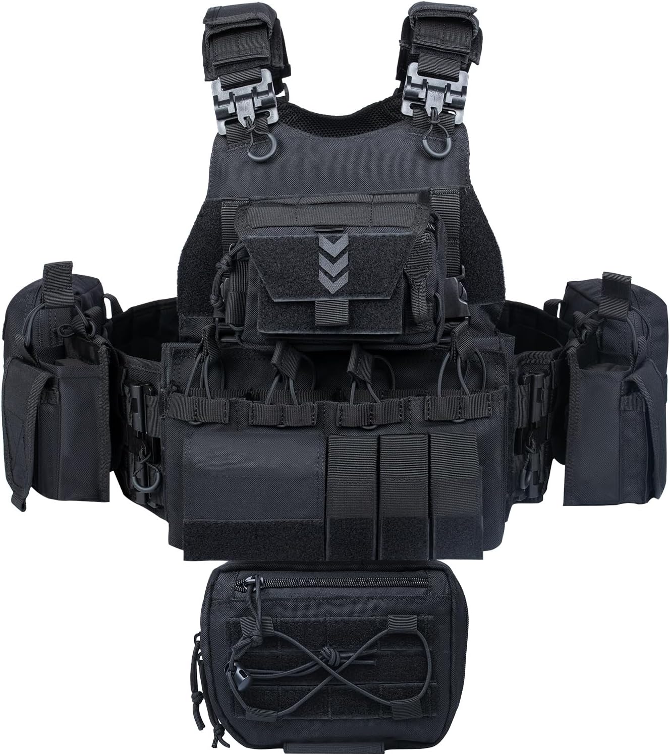 Full MOLLE/PALS webbing across the front and back panels allows modular attachment of pouches, accessories, and gear. All attached components can be reconfigured or removed entirely to suit the mission or activity at hand. The vest fits a wide range of body types through hook-and-loop adjustment on the shoulder straps and a cummerbund that accommodates waist sizes from 27.5 to 51 inches.